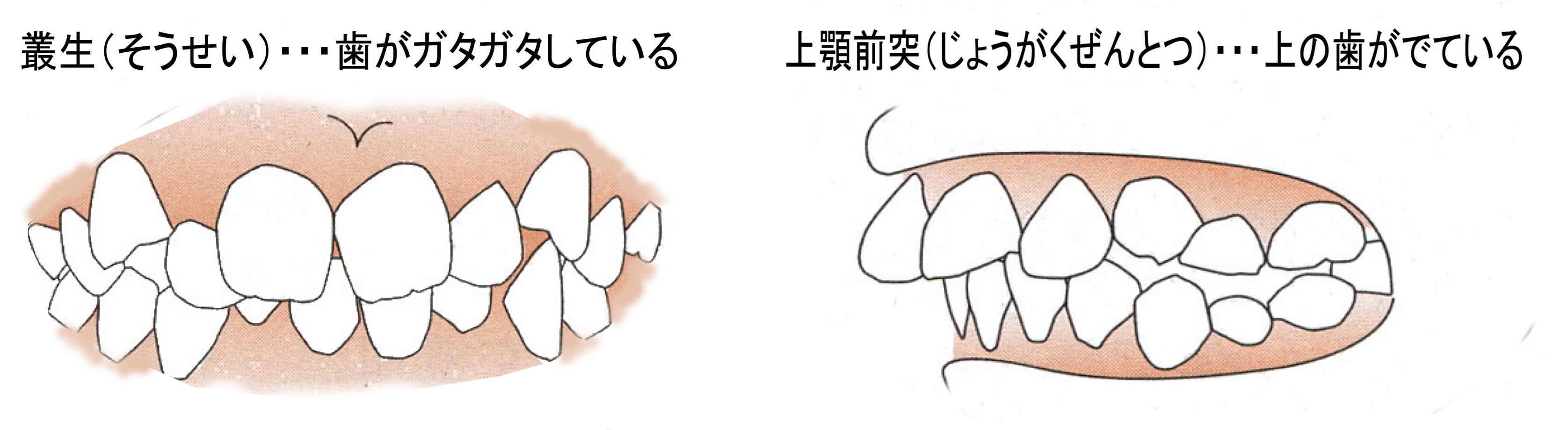 【1】叢生(そうせい)・・・・・歯の並び方が真っ直ぐではなく、ばらばらガタガタした状態の歯並び。